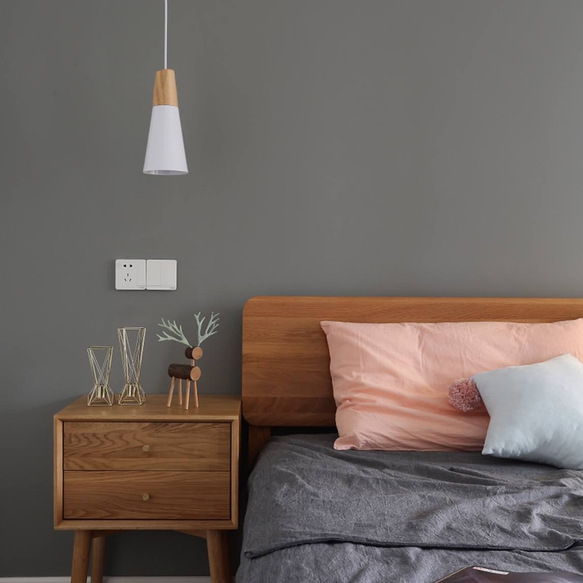 艺术气息的吊灯给整个卧室填满了艺术色彩 木制的床头柜,又平添了几点复古意味 简约的三件套又中和其中的风格
