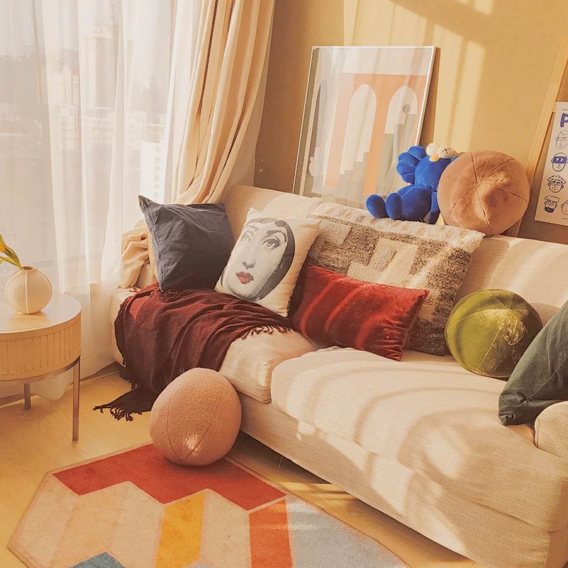 在软装风格上霉莓用了很多跳跃的颜色,整体风格上运用了比较有设计感的家居饰品。所以我定位是【轻法式复古ins风】,也有一点点摩登的风格。