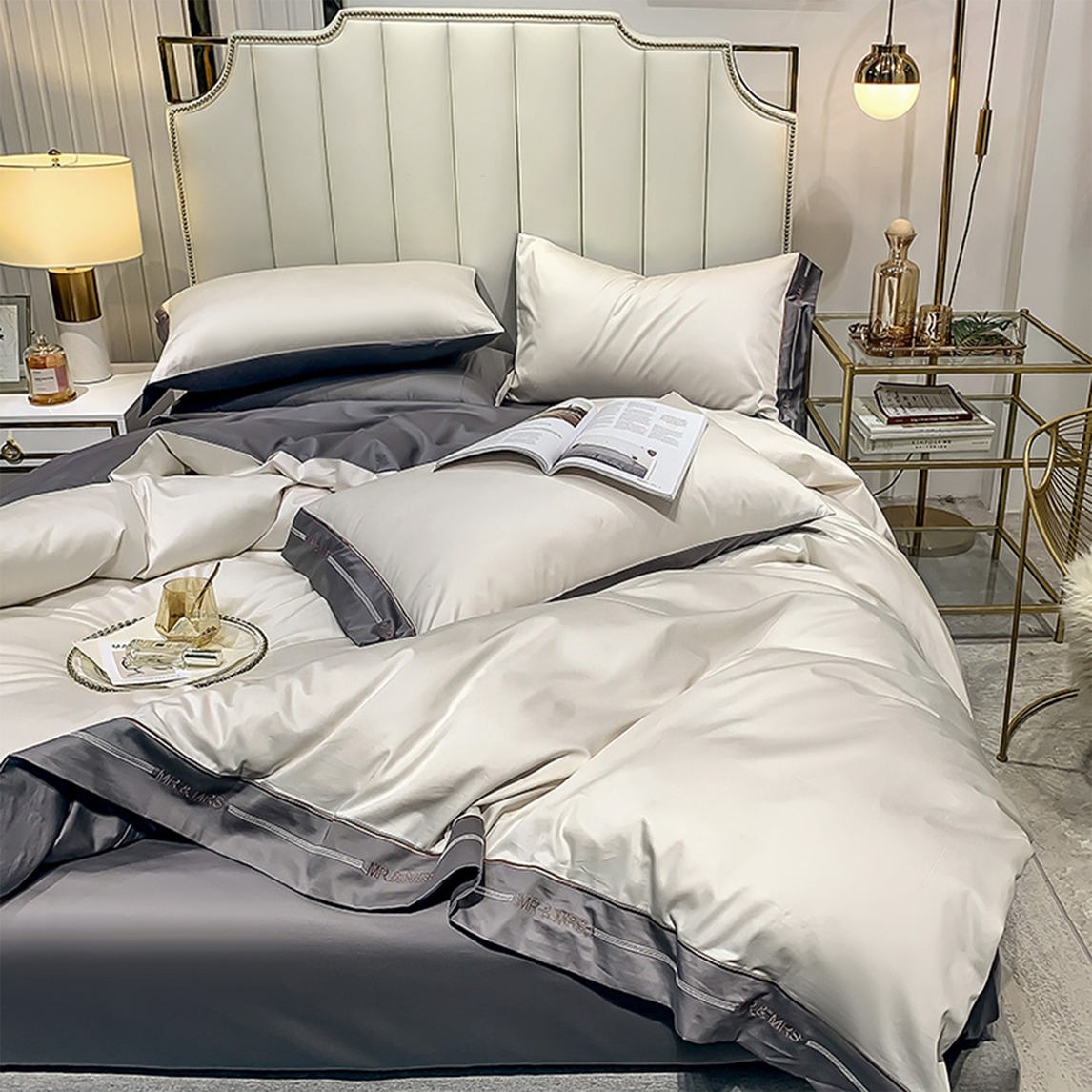 堪比五星级酒店的卧室设计,简约大气的轻奢风高靠背双人床,铺上灰白撞色的长绒棉四件套,高级的质感,享受完美的睡眠。