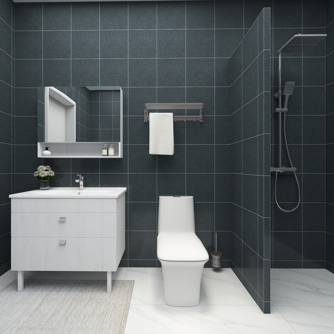 大面积的暗色系墙砖,搭配亮银的花洒和纯白的浴室柜,为整个暗调的空间中增添了一抹亮色,不会破坏整体冷淡的风格,也不会给人以黯淡太过于冰冷的感觉