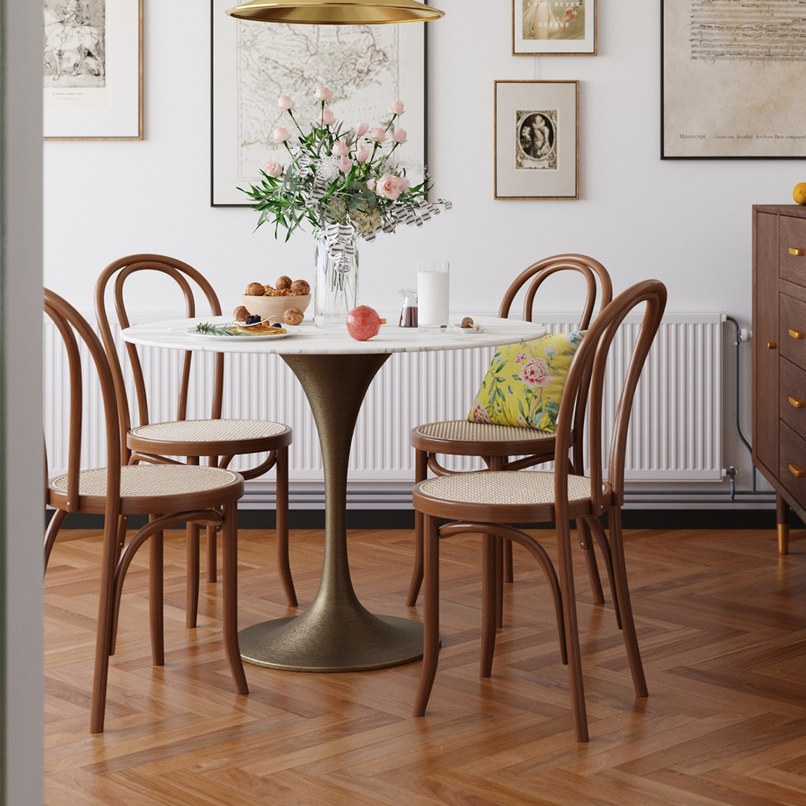 一张圆形的复古餐桌,搭配上几张复古的椅子,满满的复古风餐厅就出来效果啦,简单的摆设就可以让餐厅温馨,慢慢享受我们的进餐时光!