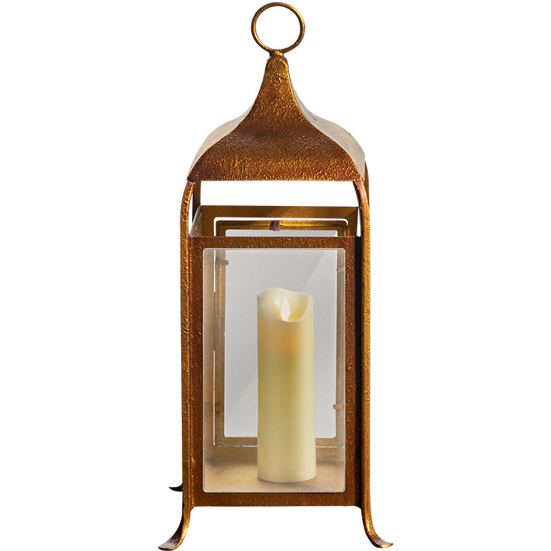 造型独特,铜材的运用、加上自然的古铜色,使风灯具有年代感,彰显高质感。圆柱玻璃风灯上方由铜材包边,触感光滑,做工精致;铜质底座,厚实富有质感,能保障整体稳定性。