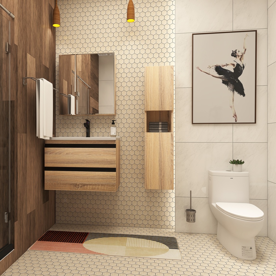 原木色的浴室柜也可以打造出轻奢风的韵味,搭配原木风的墙砖,配备一款温暖黄的灯光,整体的氛围在一点一滴的搭配中弥漫出来