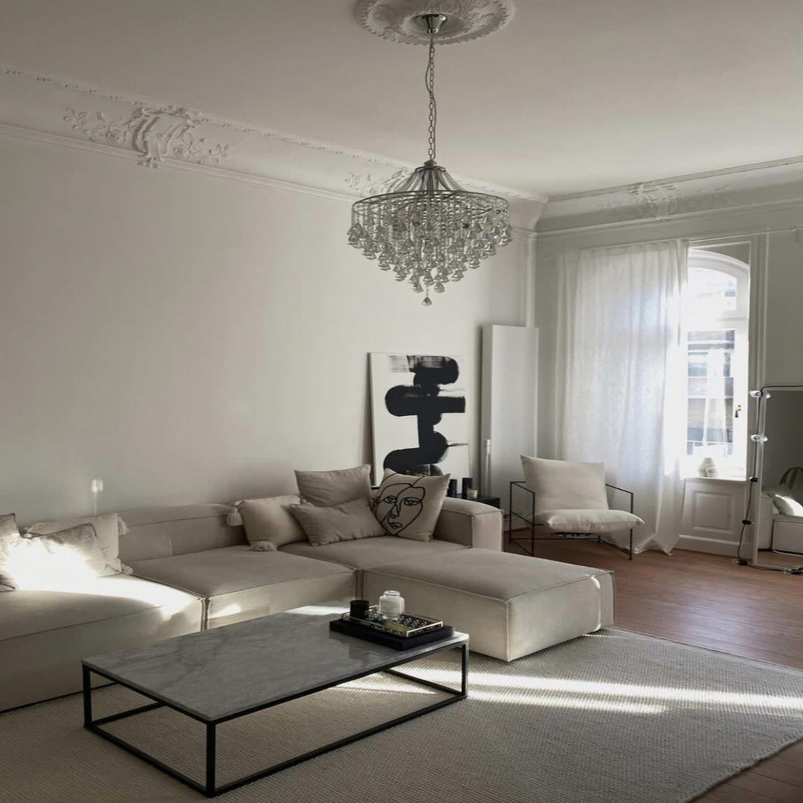 超美法式公寓 生活的优雅延伸 时尚博主法式私宅 超美的墙线和水晶灯 简约又经典的家私选择,不会觉得浮夸 优雅的生活空间~ 给人一种惬意自在的氛围,很是随性 在这样的客厅中多呆一下,都会让人放松舒适的。