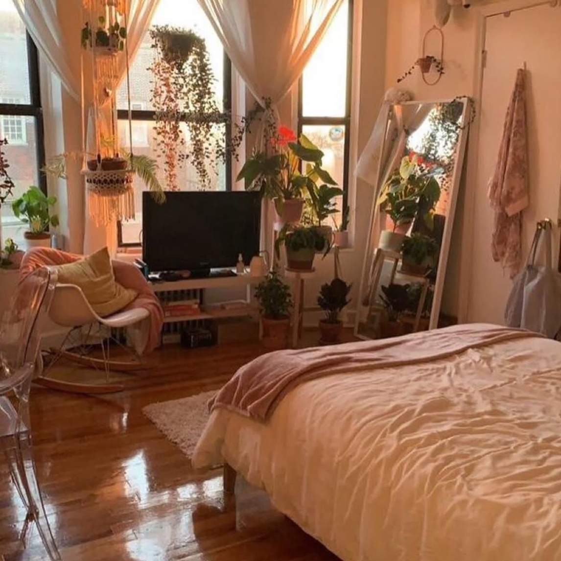 绿植包围的家, 清新又舒适 原木小屋被绿植包围着,阳光暖暖的洒进小屋里,真是清新又舒适,躺在这样的沙发看电视,也太幸福了叭~ .