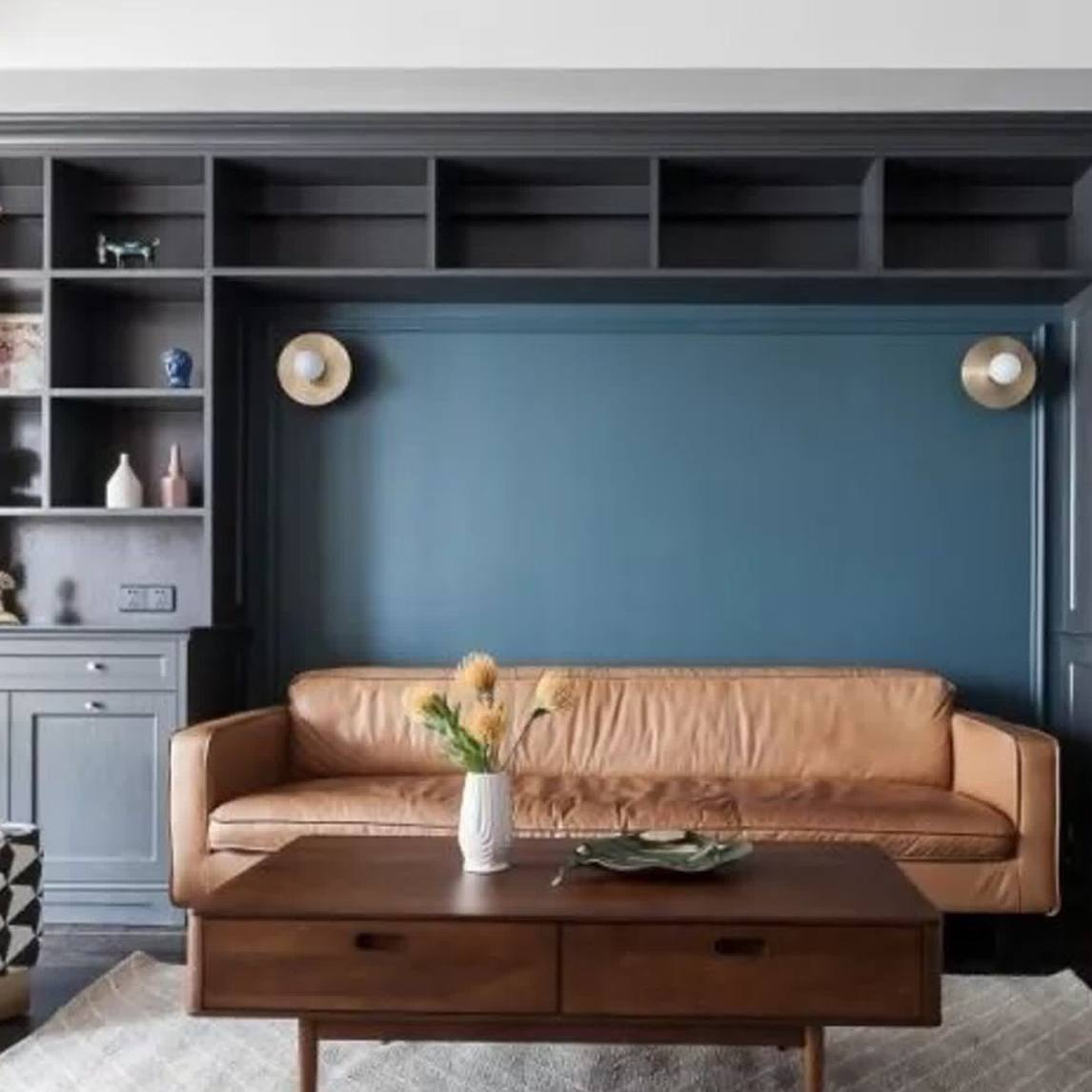 法式复古|超强色彩质感之家 1.客厅整体呈围合布局,动线流畅。嵌入深灰蓝色背景墙的皮质主沙发纹路自己触感柔和,纯黄铜底座放凳的面料分别选用了千鸟格和磨砂皮,地面是做旧的烟熏色木地板,每一寸空间都有着...展开