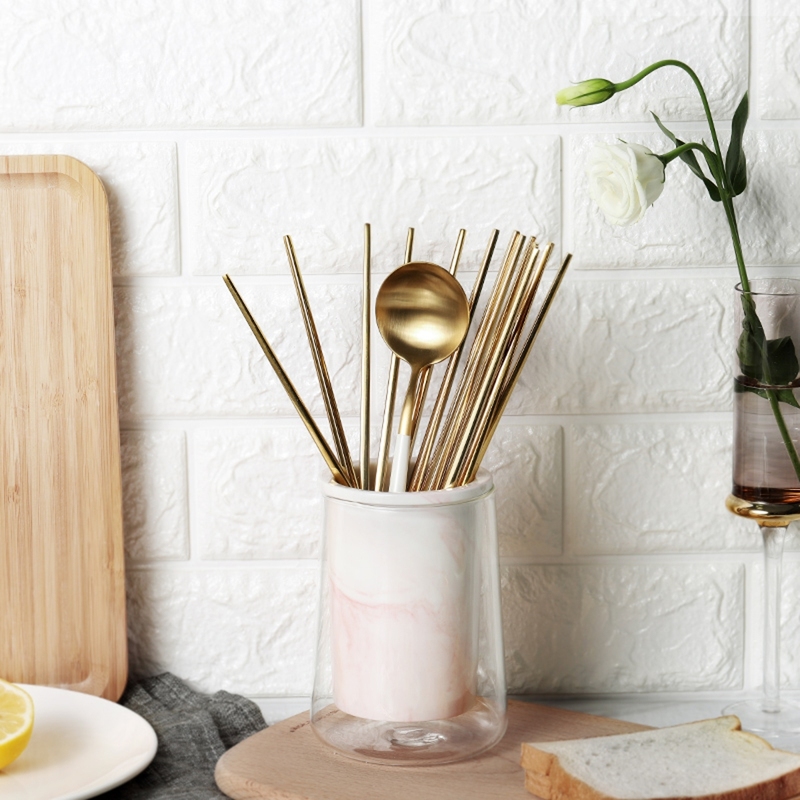 这是一款简约时尚的桌面摆件,清新的装修风格,皮革桌布简单实用,加上木盘和不锈钢筷子,和透明的玻璃杯子,这款摆件更加简约现代化,提升家居感。