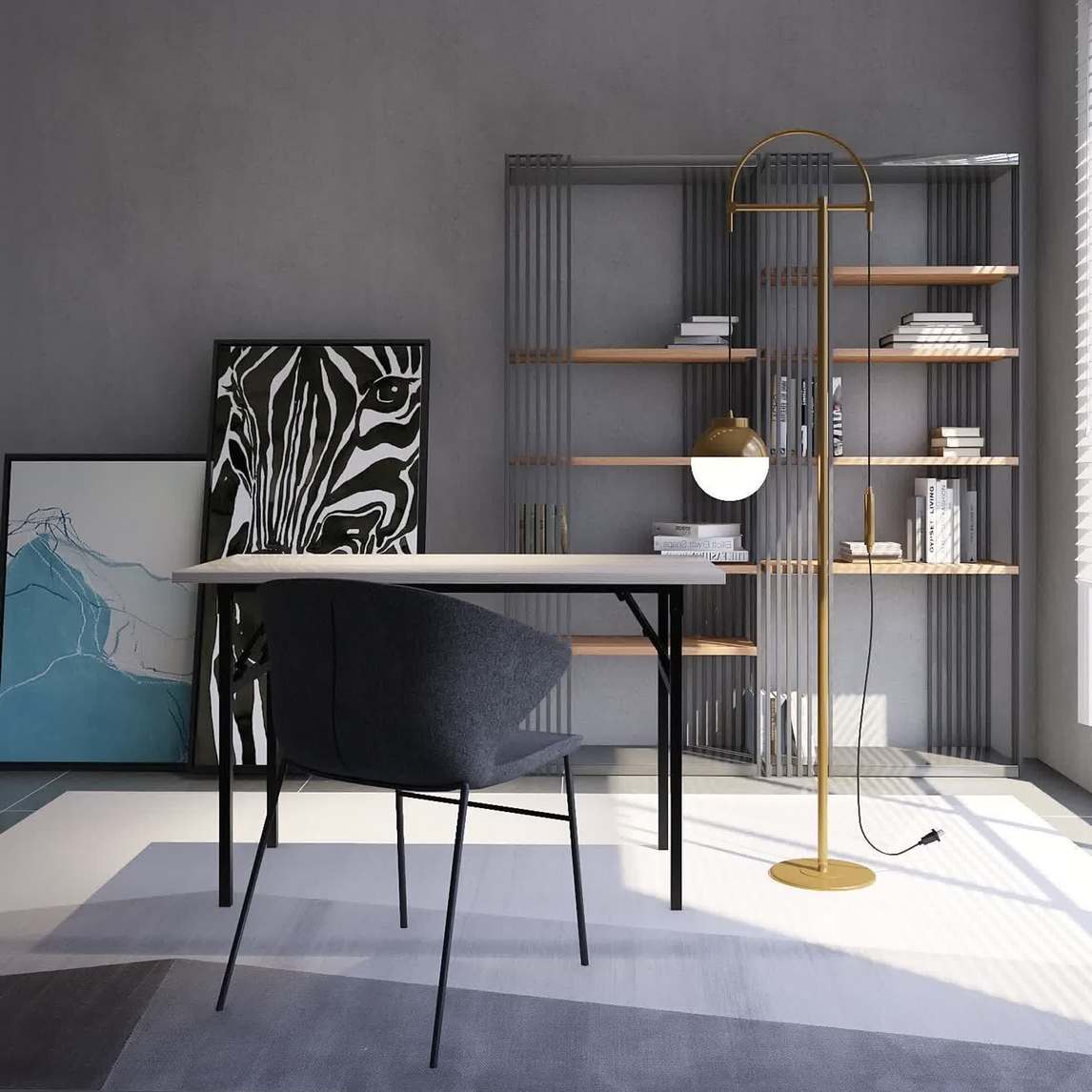 整个空间都选用深沉的灰色调来打造,灰色的纹理墙布、哑光的灰色地砖,加上灰白色的几何地毯,共同打造出一个神秘而富有质感的时尚空间;然后选用铁艺材质的书架和简约书桌椅进行搭配,打造出硬朗帅气的工业风,再加...展开
