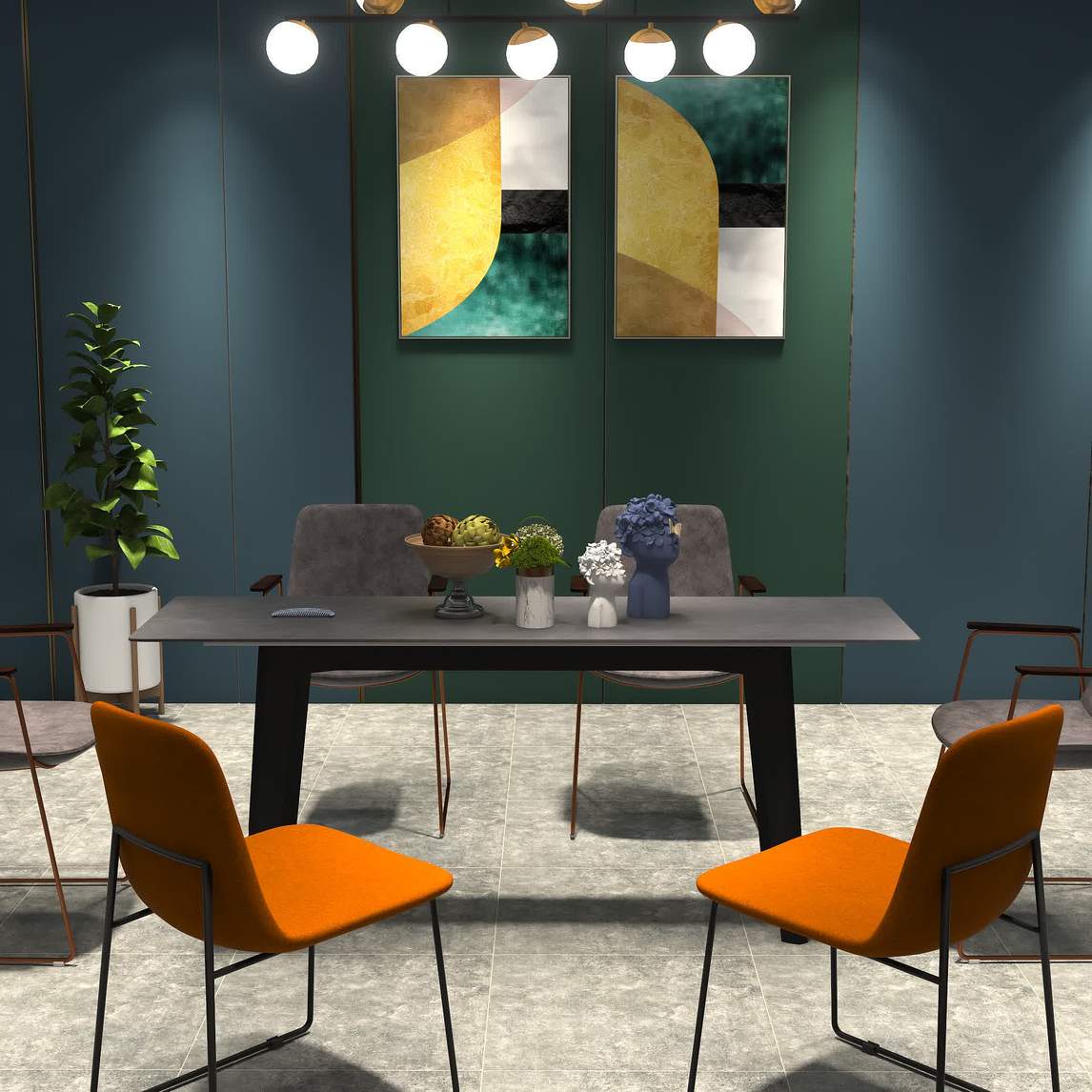 餐厅是一个家庭中最有凝聚力的地方,又是一个充满浪漫、温馨的空间,餐厅尽显简约风特点,藏蓝+灰色的配色经典时尚,给人以轻松舒适。餐厅如果面积小,可以利用卡座设计,节省空间又能增加储物。