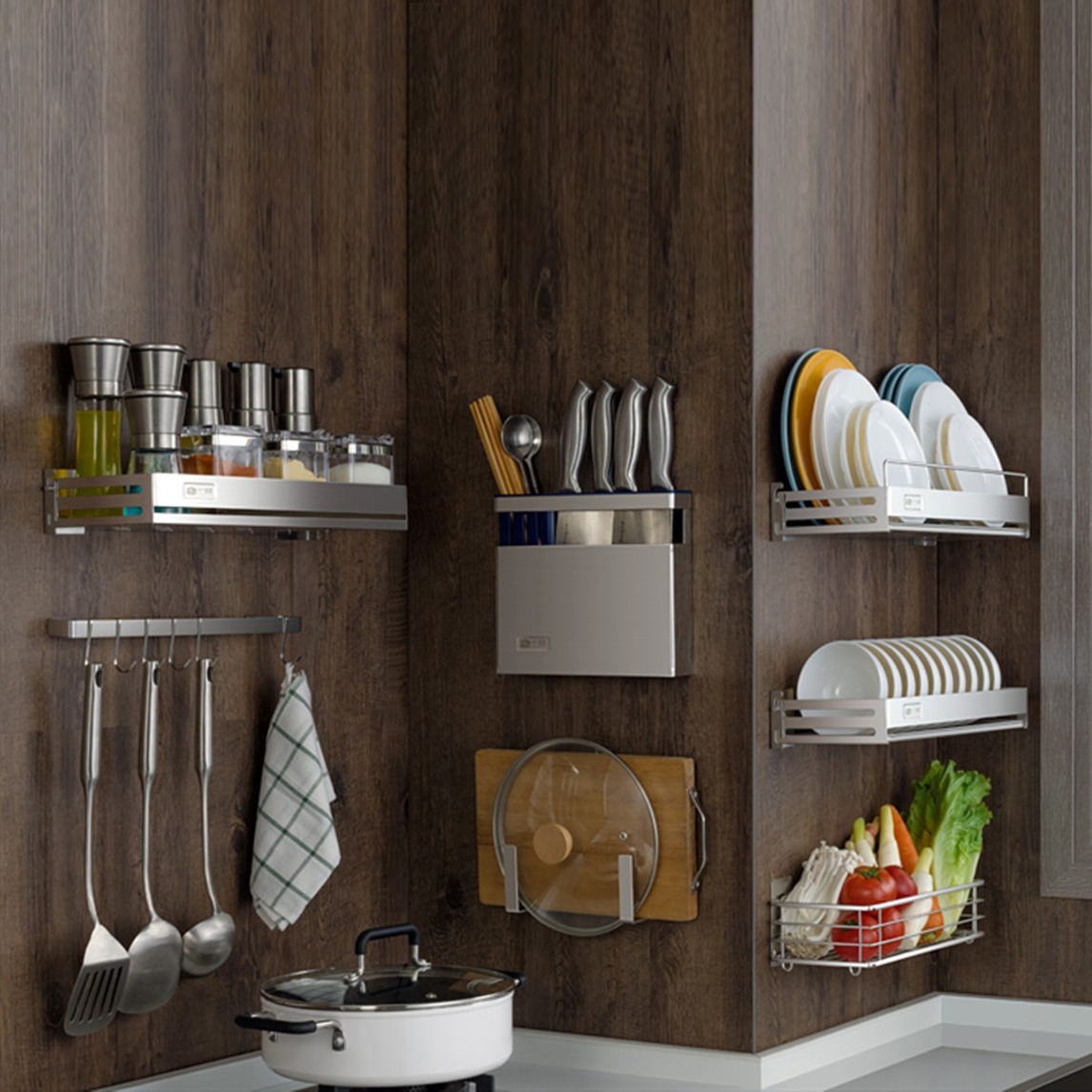 304不锈钢厨房调料置物架,充分利用厨房碎片空间,尴尬局促角落也能装,放大厨房空间。开放式收纳,烹饪调料伸手可取。