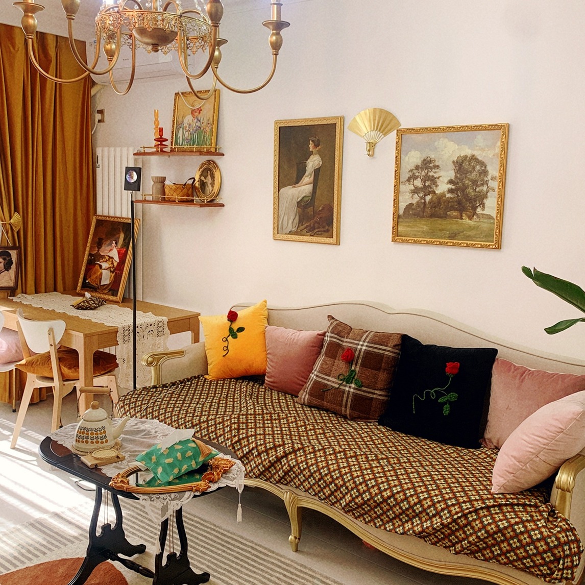 法式复古吊灯,柔和的珠光,超级浪漫~ 复古挂画,浪漫的挂画,颜色也很好看。 复古边桌,可以放在客厅还可以放在阳台。