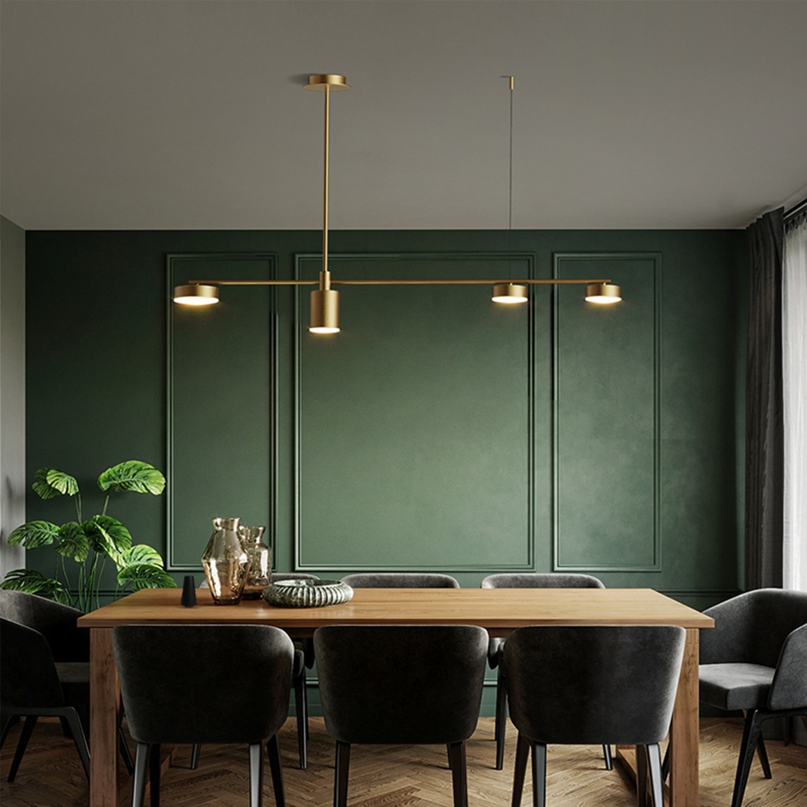 当餐厅遇上复古绿,又会迸发出怎样的魅力呢?整面墙以复古绿作为主色调,搭配金属个性吊灯,极具个性。 如果觉得空间过于沉闷,还可以搭配清新绿植装饰,增添元气感~
