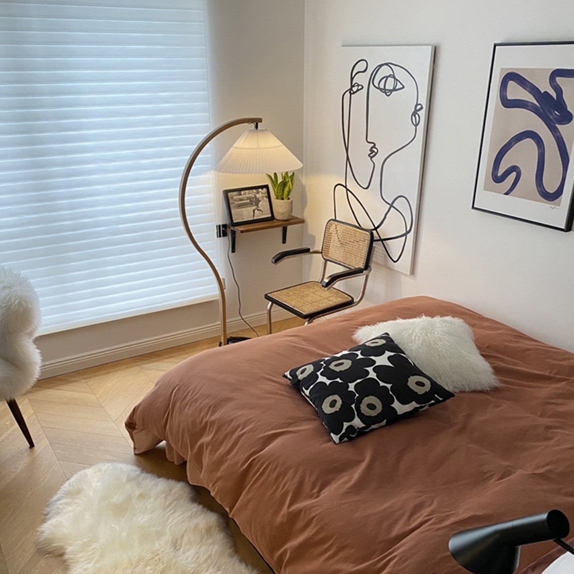 复古风卧室重要的要善于利用灯源,选择一款造型别致的暖光灯,搭配复古橘色床上用品,用白色不规则毛绒地毯点缀即可。