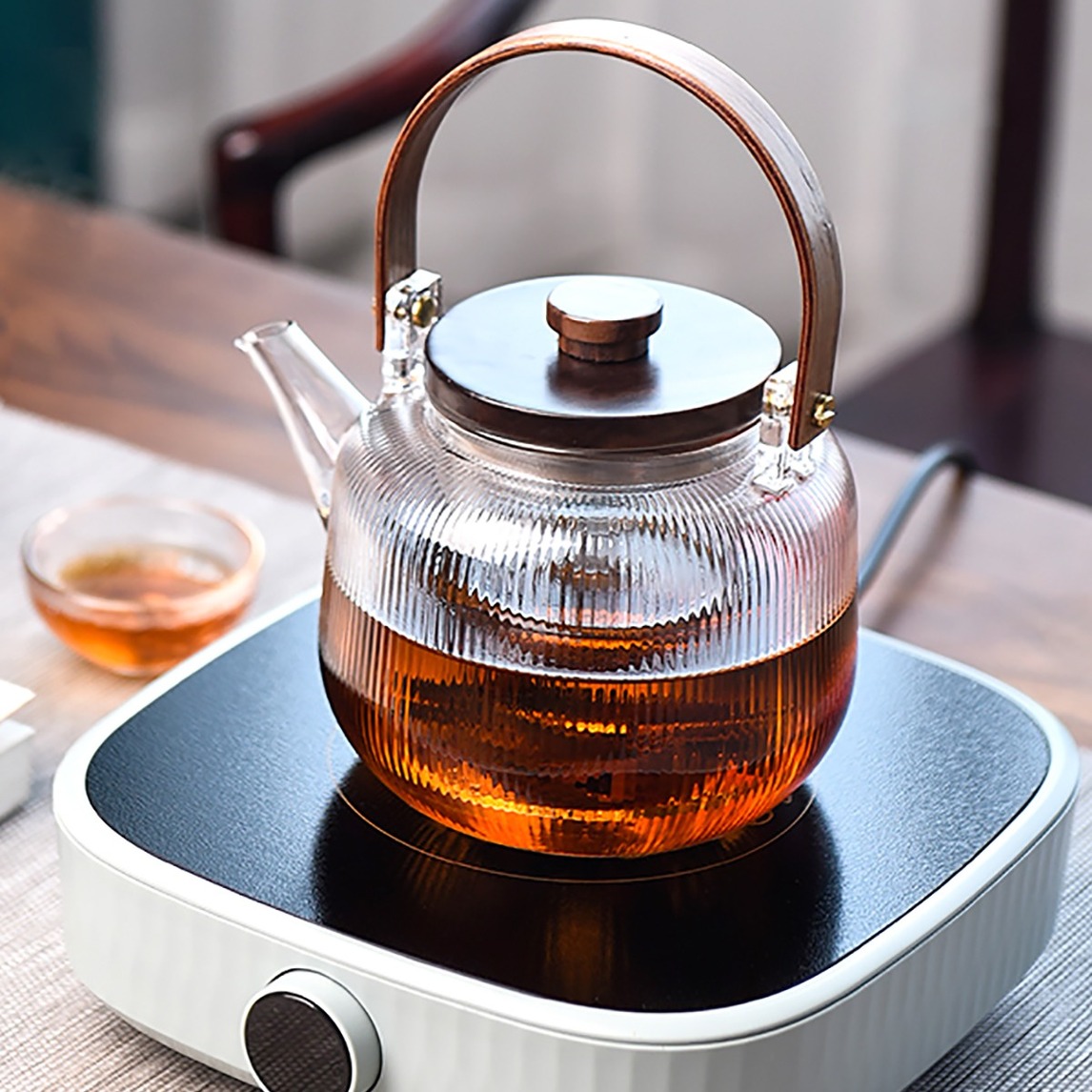 蒸煮两用玻璃壶,胡桃木盖和提梁搭配玻璃壶体,天生高雅气质,大容量,高硼硅玻璃材质,耐高温不炸裂,煮茶无异味,还原纯口感,为品茶注入一丝尊贵~