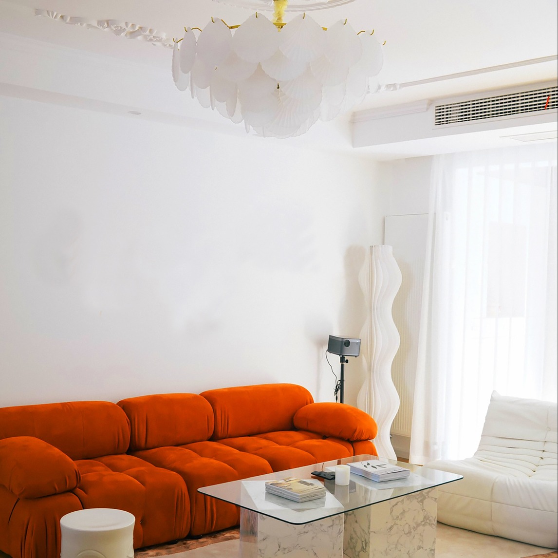 客厅的墙面刷的大白墙,所以软转怎么都好搭配,沙发就大胆选择了橘色的,颜色亮丽,大理石茶几看似简单可是显得高级,人脸坐凳也是设计很出彩的单品,再用一盏白白净净的吊灯和大大的短毛地毯一融合,时尚而温暖的法...展开