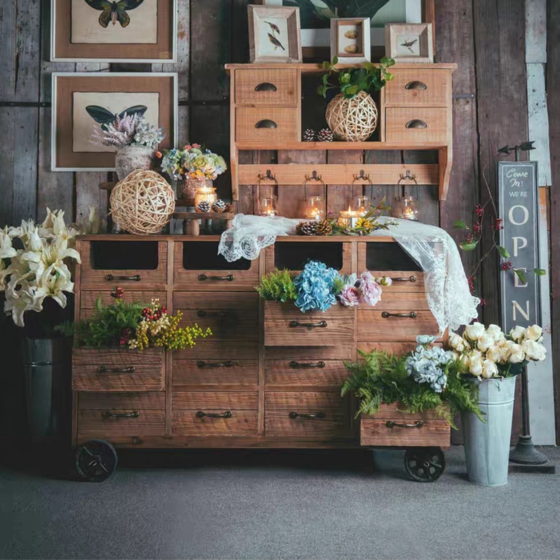 做旧实木柜带轮子,选用杉木制成,大小和坚固程度符合人体构造,拍照也美美哒!自然原木效果,16抽设计,收纳实用性也是满分哦!