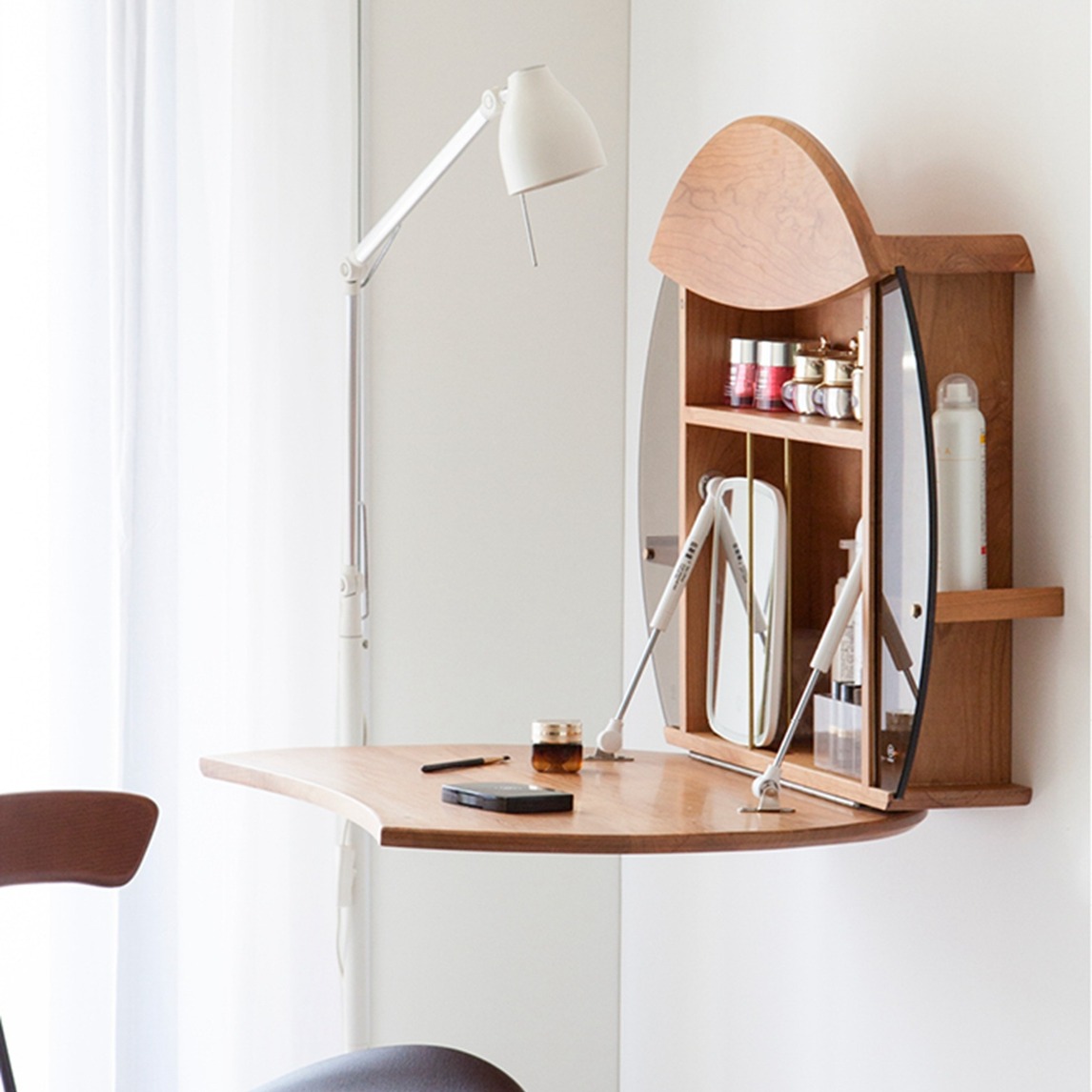 特别喜欢这款月圆壁挂梳妆台,造型很独特,挂在卧室就像一件装饰品。但它确确实实是一款梳妆台,挂柜是折叠起来的,厚度仅有15cm,比较窄小的过道空间也可以安放。它虽然身材小,但是却有丰富的收纳空间,可以满...展开