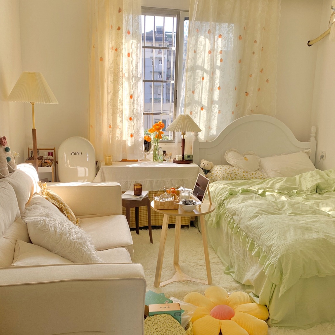 即使租来的无屋檐,也要精致与美丽,不大的卧室,要摆放自己喜欢的东西真的太多了,整个房间的配色清爽简单,淡淡的绿色四件套是我周末赖着不起床的理由,百褶灯复古又时尚,真的是麻雀虽小五脏俱全。