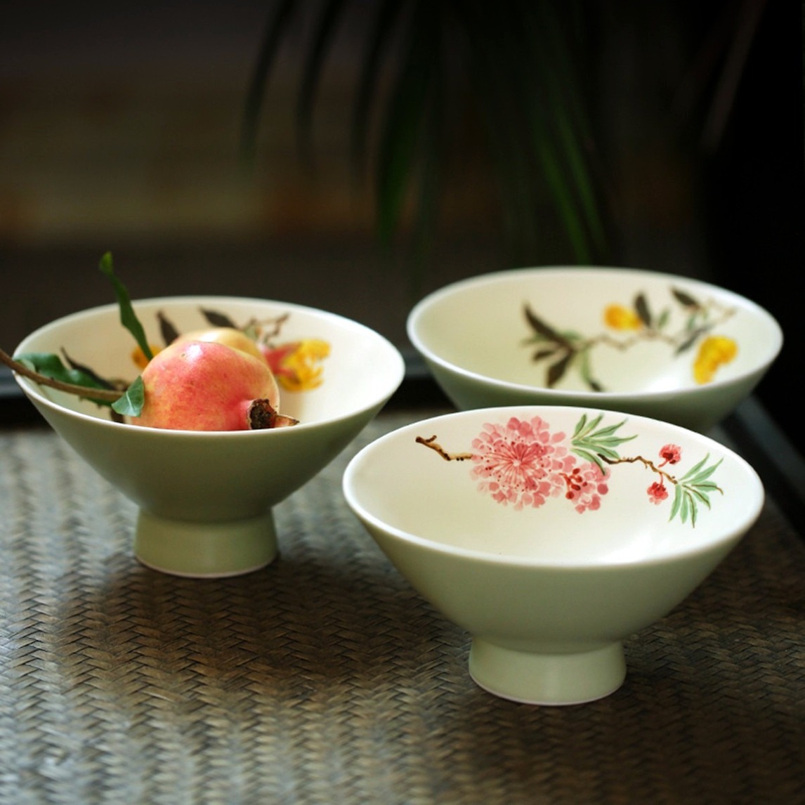 好茶当然要配精致的甜点,品茶叙旧,滋味也会更足。独特的斗笠碗,很适合作为点心盘,手绘的图案,清新典雅,为喝茶增添风景。