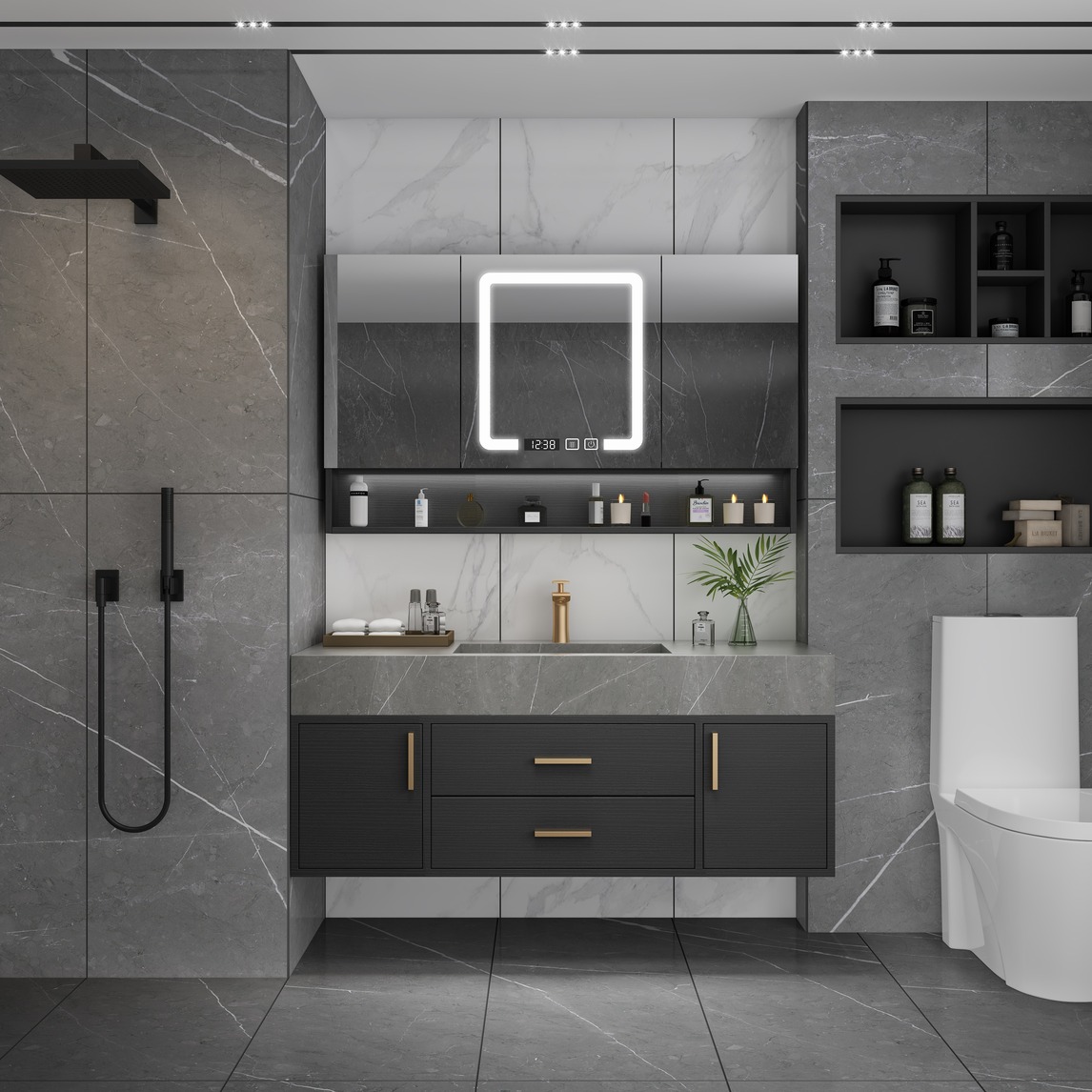 多色可选,支持定制。岩板台下盆,岩板一体盆,大理石台下盆。自由定制,多宽镜柜可选①智能镜柜下储物柜②全镜面智能镜柜③智能单镜面