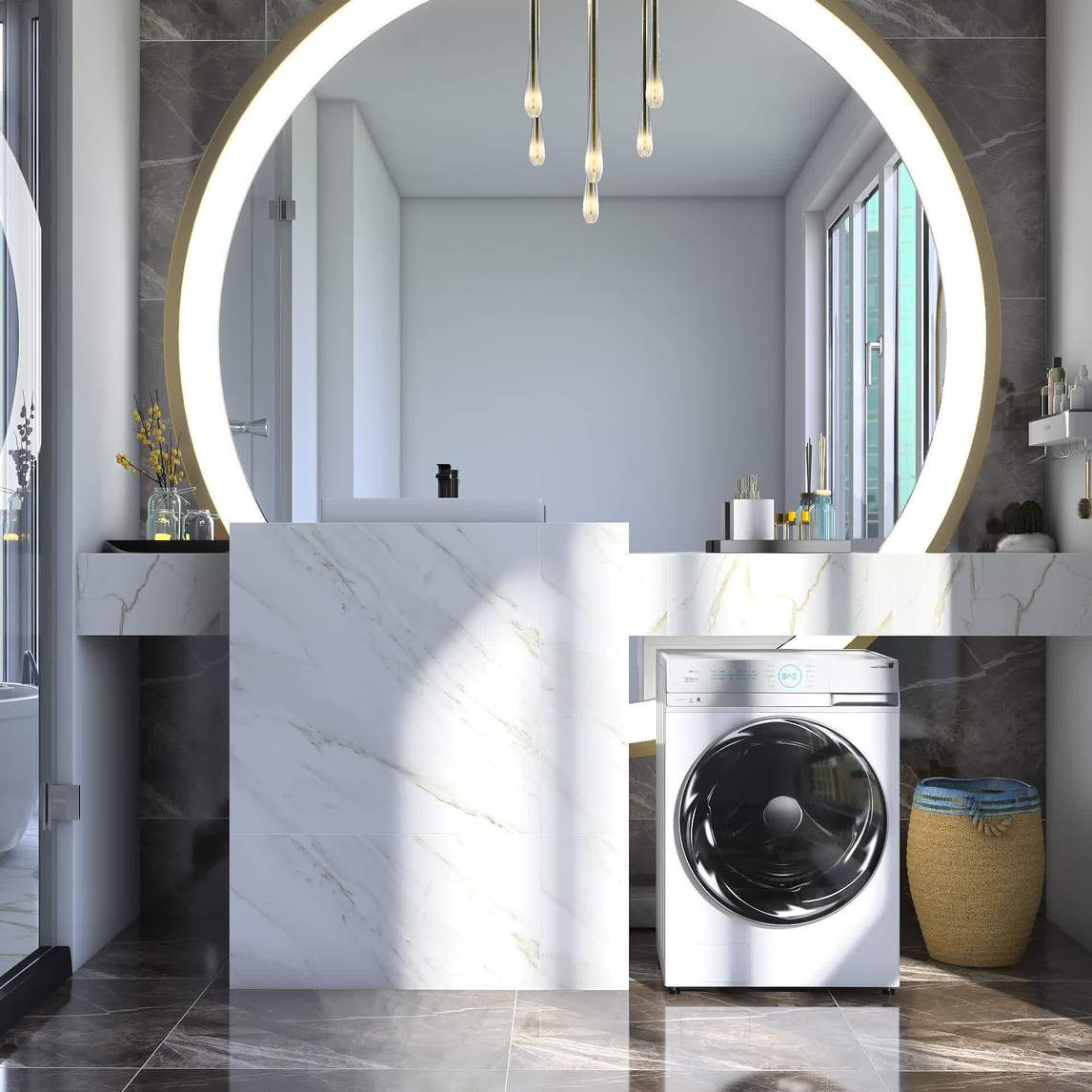 设计师说: 轻奢风格的卫浴间,使用了很多镜面元素,有效延伸了空间,玻璃门和光滑的地面也有这样的作用。在轻奢感的卫浴间之中,小天鹅10KG水魔方洗衣机可谓独特的存在。不仅有符合现代人审美的设计,还有专业...展开