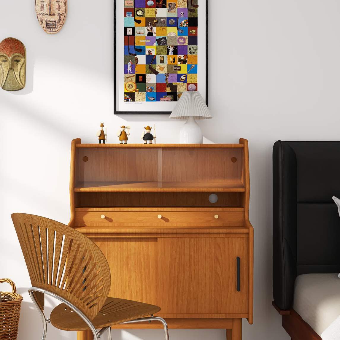 墙壁使用简单的白色,选择一些深色家具,与背景形成鲜明对比,营造出悠然而复古的卧室风格。加入非洲装饰元素,为空间带来别样趣味