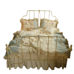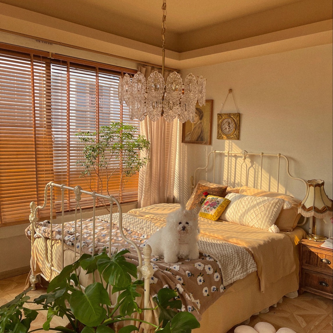 既想要拥有慵懒的法式复古风,又不想太浓郁会腻味,采取一强一弱的风格,如果墙色太过浓郁,就在床品或者小型家居上简约一点,如果墙色淡淡的像奶油色,床可以复古意味重一点也没关系~