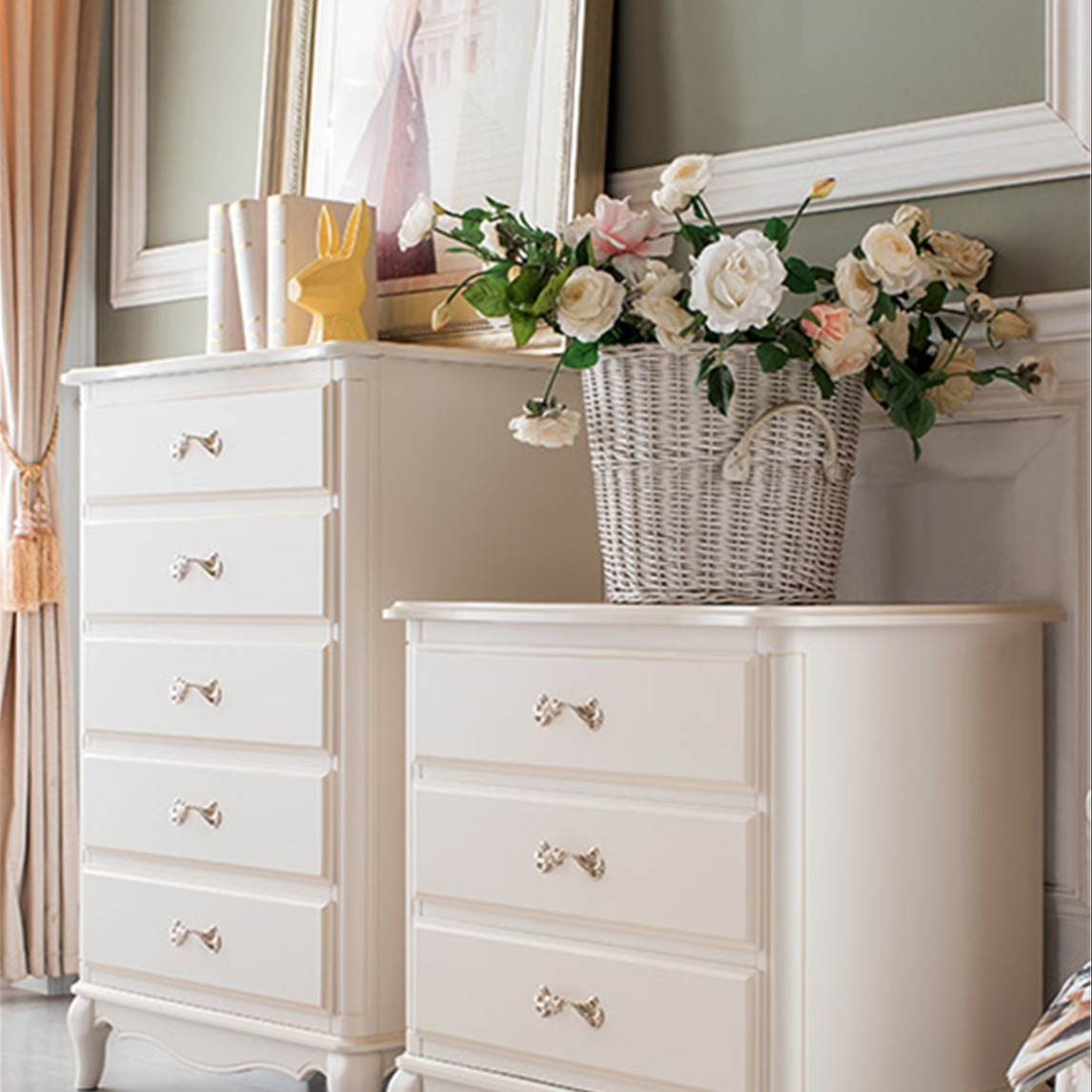 法式风格的斗柜,色调纯粹干净,给人浪漫的视觉,独特的田园色彩,为家增添精致优雅的格调;多层抽屉置物,将空间最大化利用。