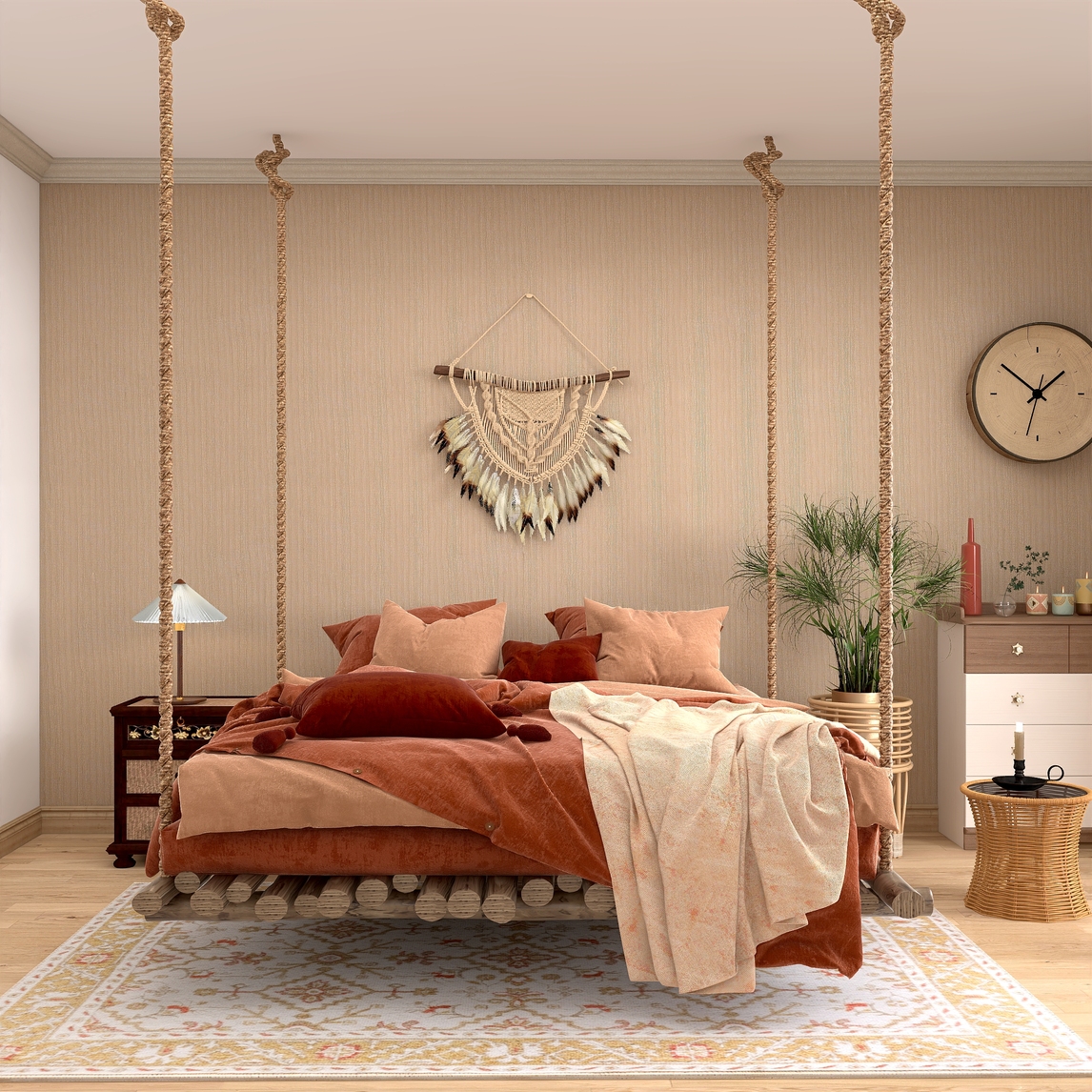 卧室采用复古气息的暖色搭配,在橘色掉墙面的基础上显得颜色十分浓烈,让颜色运用营造出一种优雅而轻奢的复古风,当然,这也是一个适合睡眠和休息的空间。