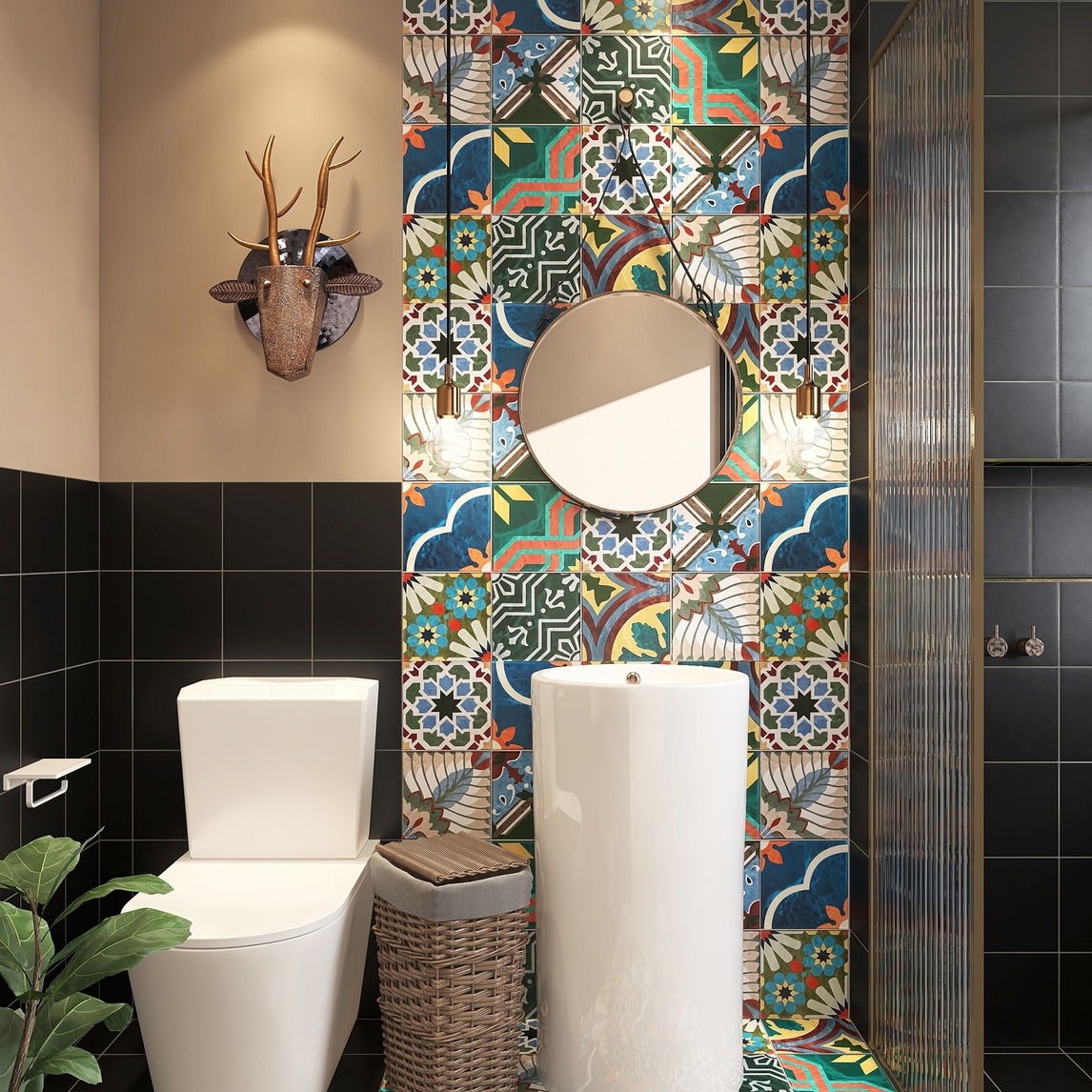 卫生间做了干湿分离的设计,干区用复古味十足的小花砖搭配黑色小方砖,湿区主要用黑色小方砖铺砌而成,整个卫生间分成左右两部分很鲜明的分界线,整体搭配起来显现出了满满的复古视觉感。