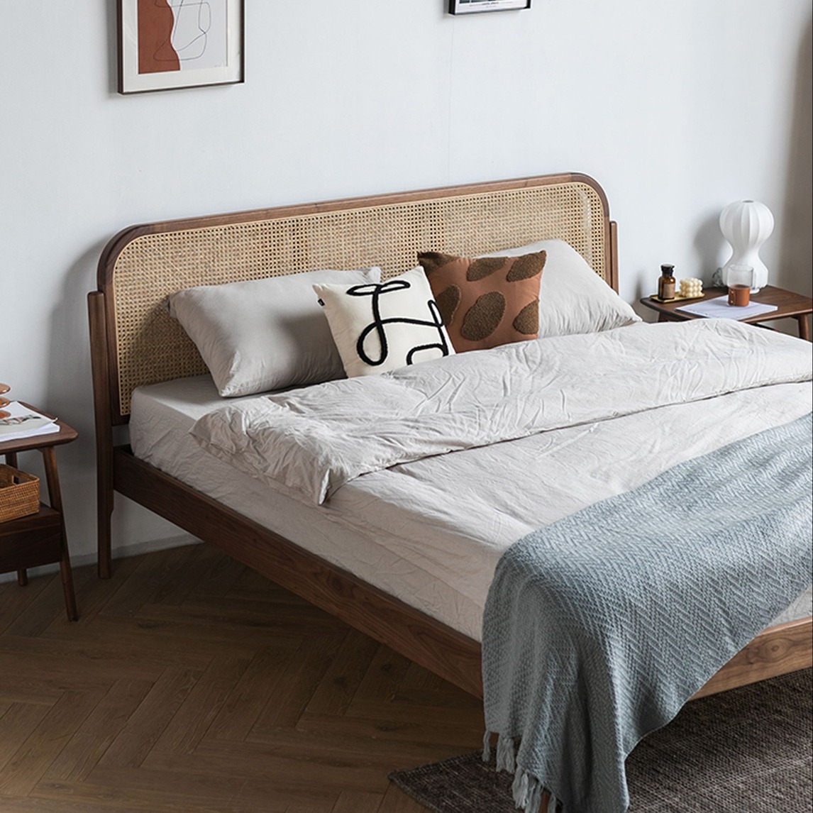 原木复古风双人床,立体雕刻花纹,与圆润柔和的脚柱融为一体,床尾榫卯相接,是祖辈们的智慧,自然契合,又能无比稳固。
