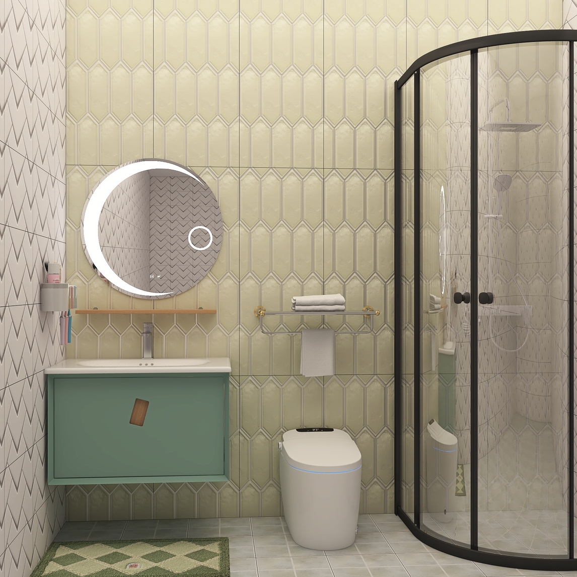 有复古情怀的朋友们可以看看这个空间,淡绿色砖作为墙砖,奠定风格基础。选择墨绿色浴室柜,增加森系元素同样还选择相近色系的壁画和窗帘,丰富空间元素。