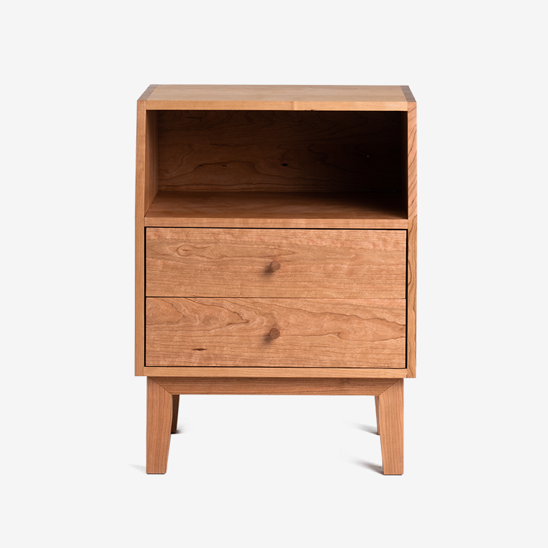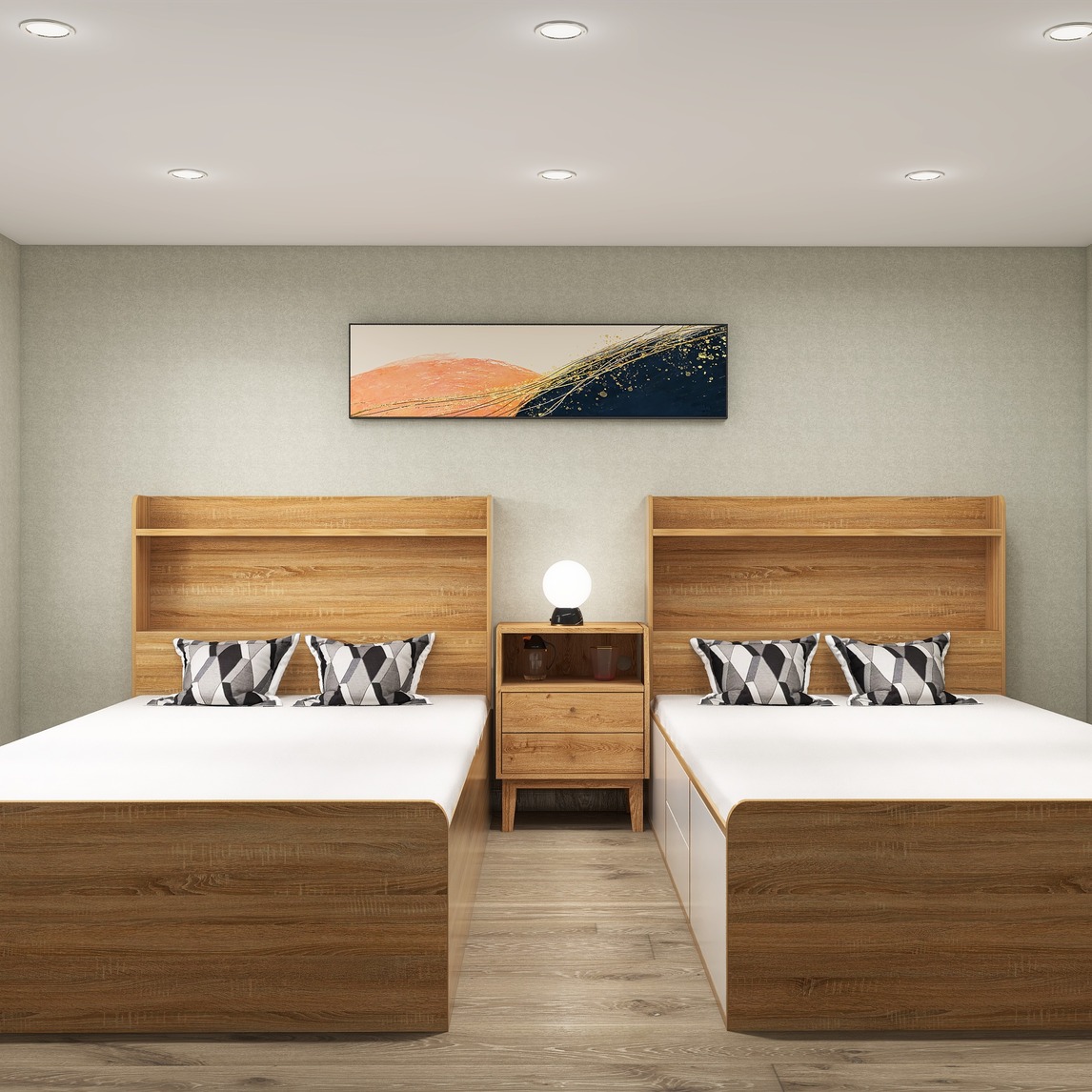 新中式风复式卧室,二层空间简约原木色的家具,与一层空间设计风格与元素上都相互呼应,给人一种一清新愉快的感觉。