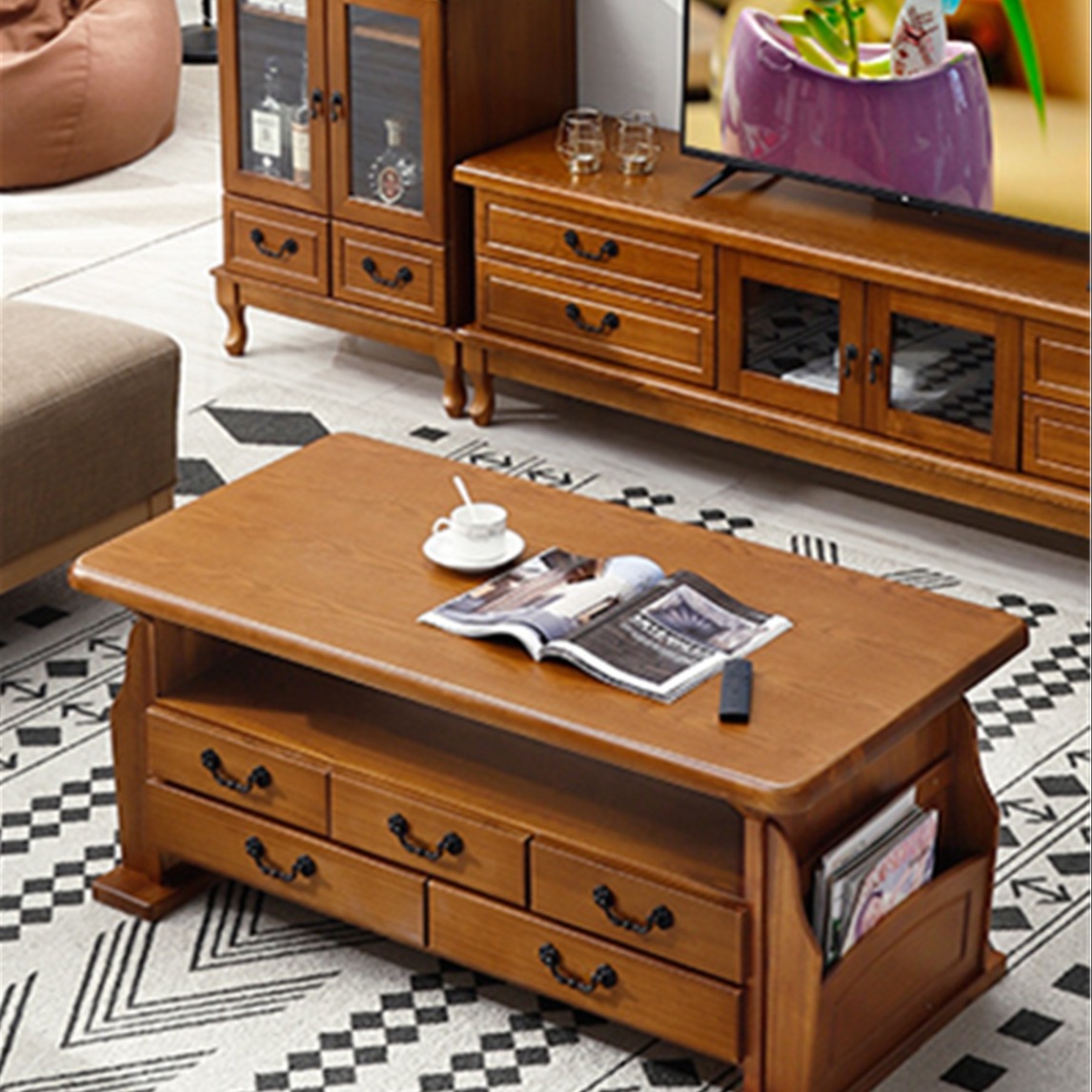 复古实木茶几,外观造型别致,选择偏深的木色材料制作,质感高级,多个抽屉设置,丰富区域的功能,让置物变得更人性化。