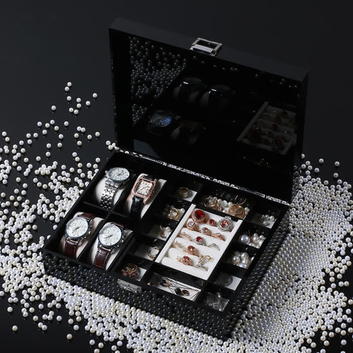 以高端的亚克力材质打造,外观上辅以黑色的色调,中间加以鎏金字母,彰显出高贵奢华的质感。内部设有双层收纳空间,且有着不同的分格区域,戒指、手表、手链等都有着各自的归属空间,在大小设计上也比较合理,符合大...展开