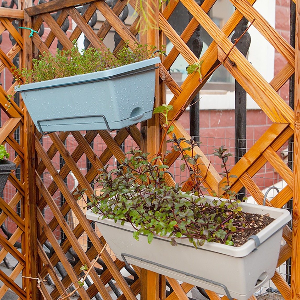 防腐木篱笆花架加上栏杆花架,可以最大程度的利用立体空间,放上几盆种菜盆,透气不沤根,种什么都爆盆,撒上些种子,家里从此不用买菜啦!