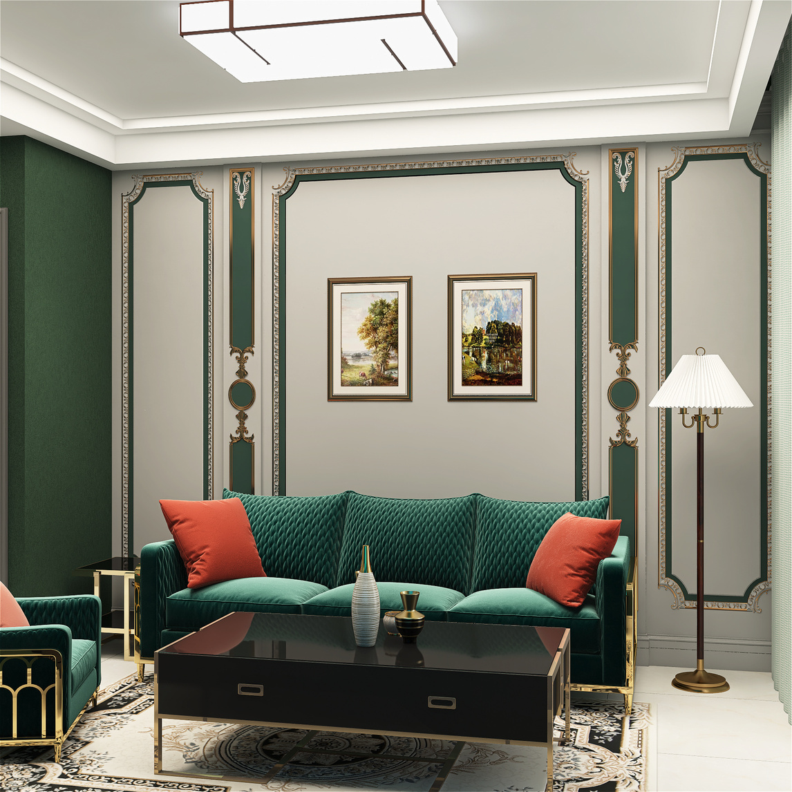随着生活品质的提高,越来越多的人喜欢追求高品质生活但也向往曾经的朴实真诚。选用绿色系沙发作为主体体现出高级感,以背景墙衬托,暗绿色沙发给人带来复古的即视感