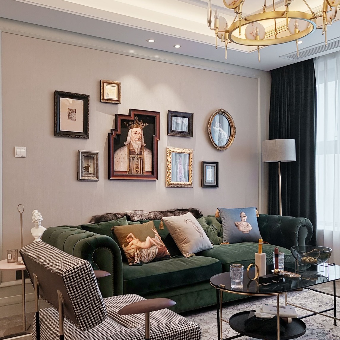 【原创设计 · Bocean 】 这套精装交付的房子,墙纸是我跟客户经过很长时间的沟通才确定下来,最后整改成了轻奢混搭复古的风格,沙发背景套画,强调复古的气氛,家具方面,绿色丝绒沙发搭配千鸟格单人座椅...展开