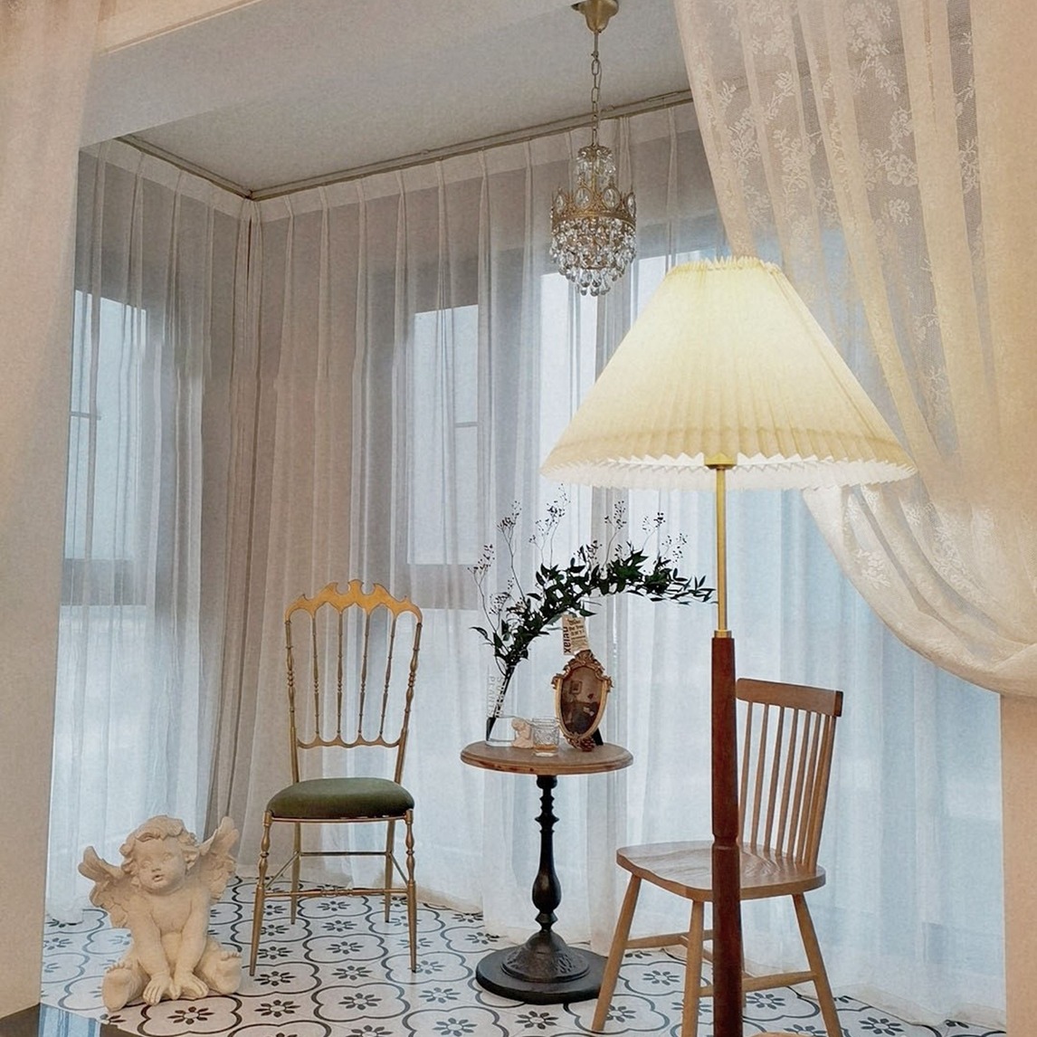 阳台是我家最美的风景.也是我每次来折腾最久的地方。复古的皇冠吊灯经典又大气,多种场景都适合,床头,过道,飘窗都可以,搭配复古又简约的百褶落地灯真的是相得益彰。