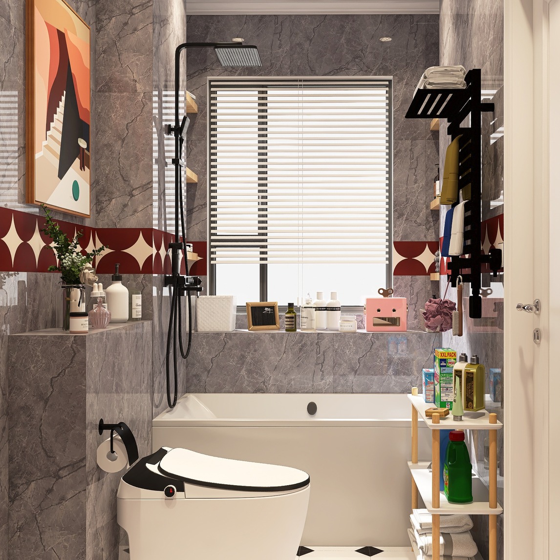 这个卫生间不是暗卫,有个挺大的窗户的,所以吊顶没有用传统的铝扣板,直接用石膏板吊顶+石膏线,洗完澡就开窗通风,一点都不会潮,石膏板比铝扣板好看很好多 大理石瓷砖选的是灰色的,纹理不是很深,选相近色...展开