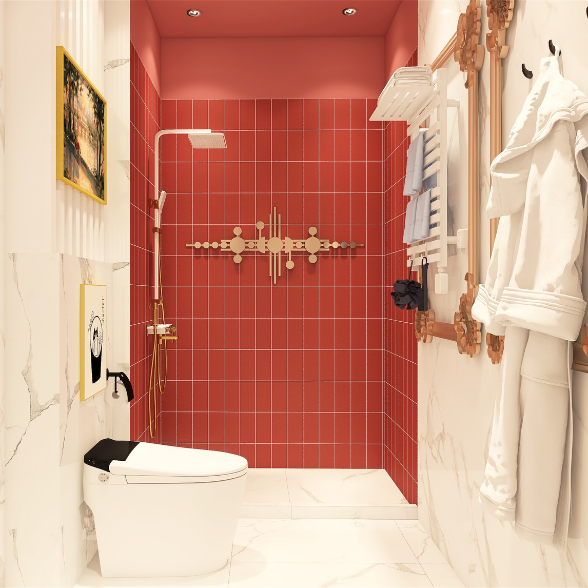 仿佛电影里面的情节,复古红瓷砖运用在浴室里面真的好好看哦 这个简单的浴室容下了轻奢好看的恒温花洒、黑科技的智能马桶和电热毛巾架,方便清洁的壁挂式浴室柜,平凡的浴室也透露出复古优雅 白金色的花洒安装...展开