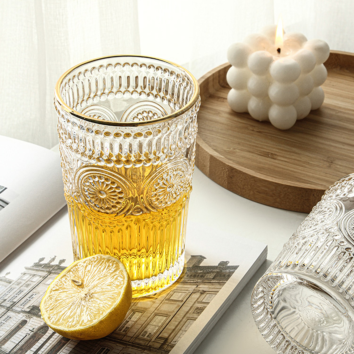 清新简约的玻璃杯,采用独特的手工描金边,经典大气美观。人工吹制的玻璃晶莹剔透,耐热耐冷不易炸裂,清洗也方便。锤目纹纹理,手感舒适,简约时尚。