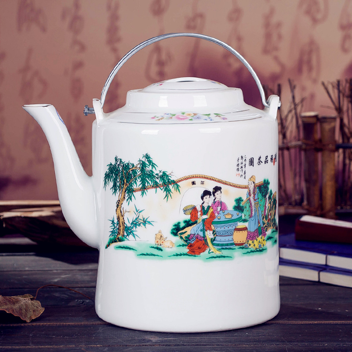复古陶瓷茶壶,泡茶壶或者是大号的凉水壶,釉上彩工艺,经过1300度高温烧制而成,耐高温,沸水可直接倒入,壶内细密的漏孔,有效过滤茶渣。