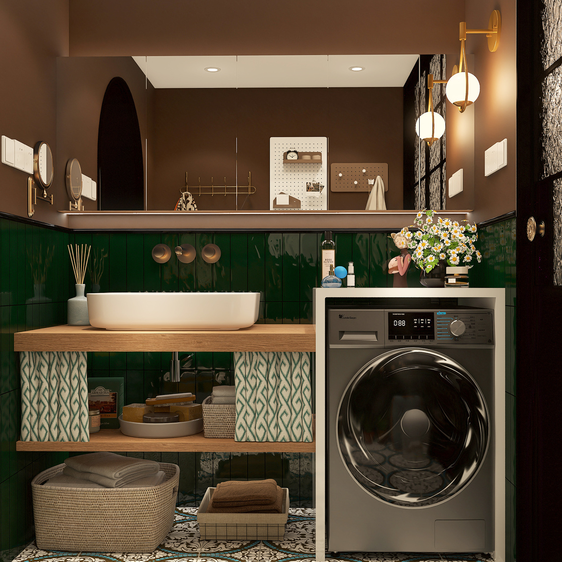 对于卫生间装修来说,一千个人眼里有一千个哈姆雷特,随着时尚潮流的发展,卫生间的设计再也不仅仅局限于传统的设计方案,卫生间干区是墨绿色与焦茶色的碰撞,不但极具视觉冲击力还给人一种浓浓的复古味,绿色小花砖...展开