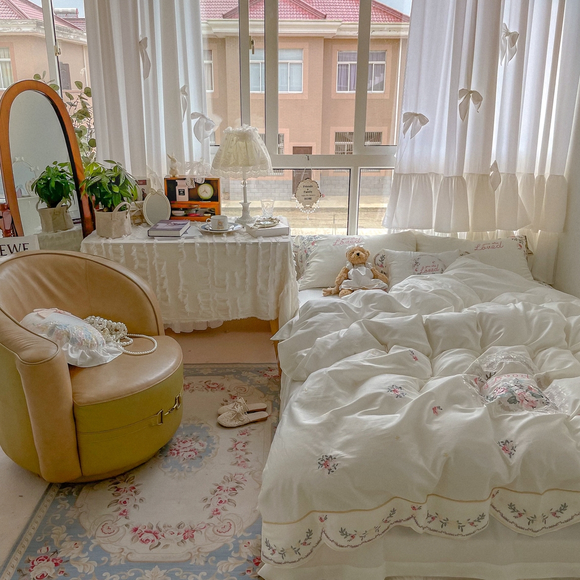 卧室整体风格是法式风格,换上了刺绣花边法式复古风四件套,风格气息更浓了,搭配轻奢单人沙发椅,幸福感满的溢出来。