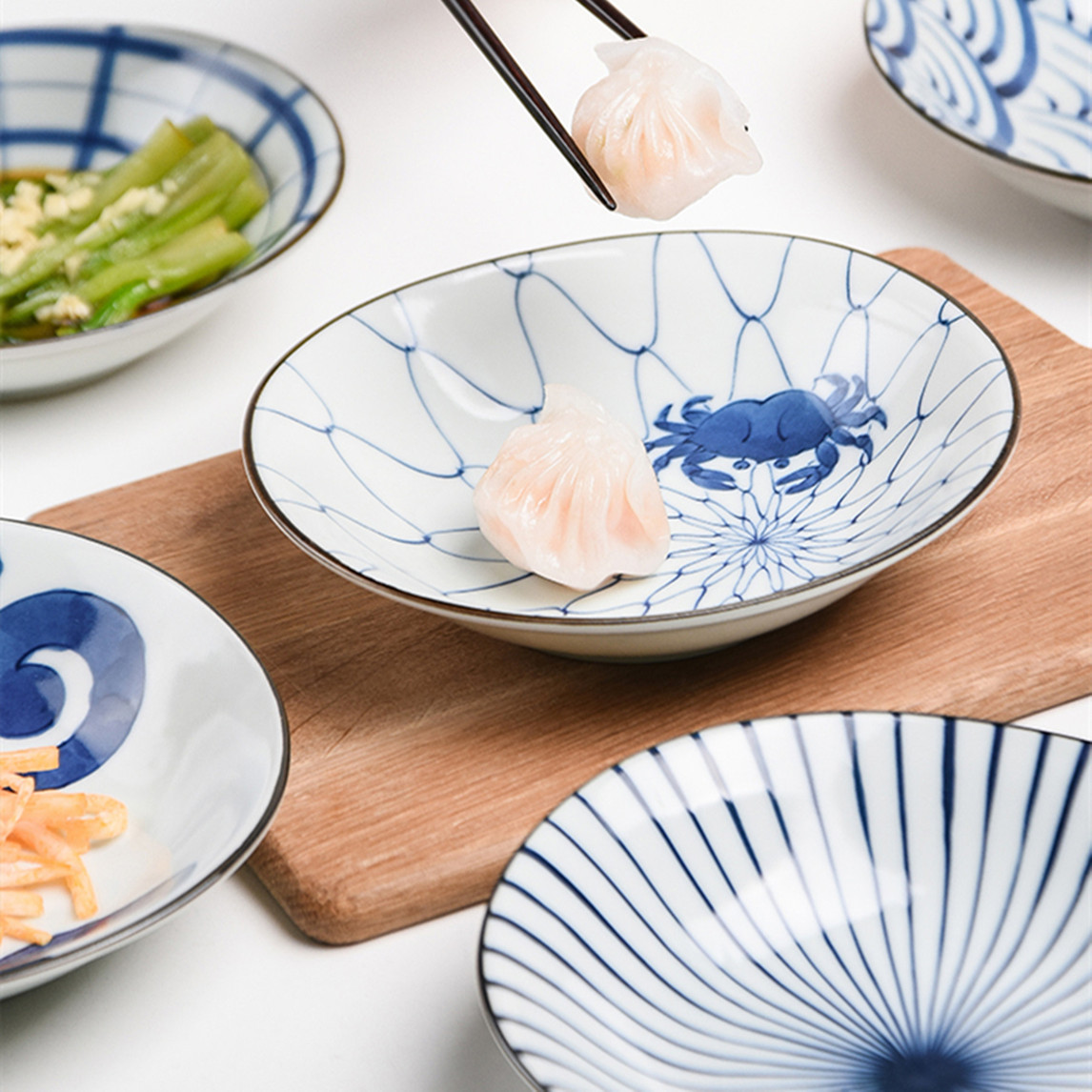 螃蟹系列大碗以及大盘外壁,采用波浪凹凸触感设计,触感舒适,压手感十足!大盘、大碗、椭圆盘、小碗、复古又百搭,无论是中餐,西餐,亦或是日料都很适合。
