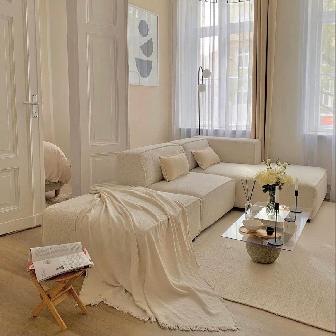摆上白色的奶油组合沙发,配上纯色的极简抱枕,在脚下放上纯色的极简地毯,阴天的时候配一个搭毯,坐或躺在沙发上享受慵懒的时光。
