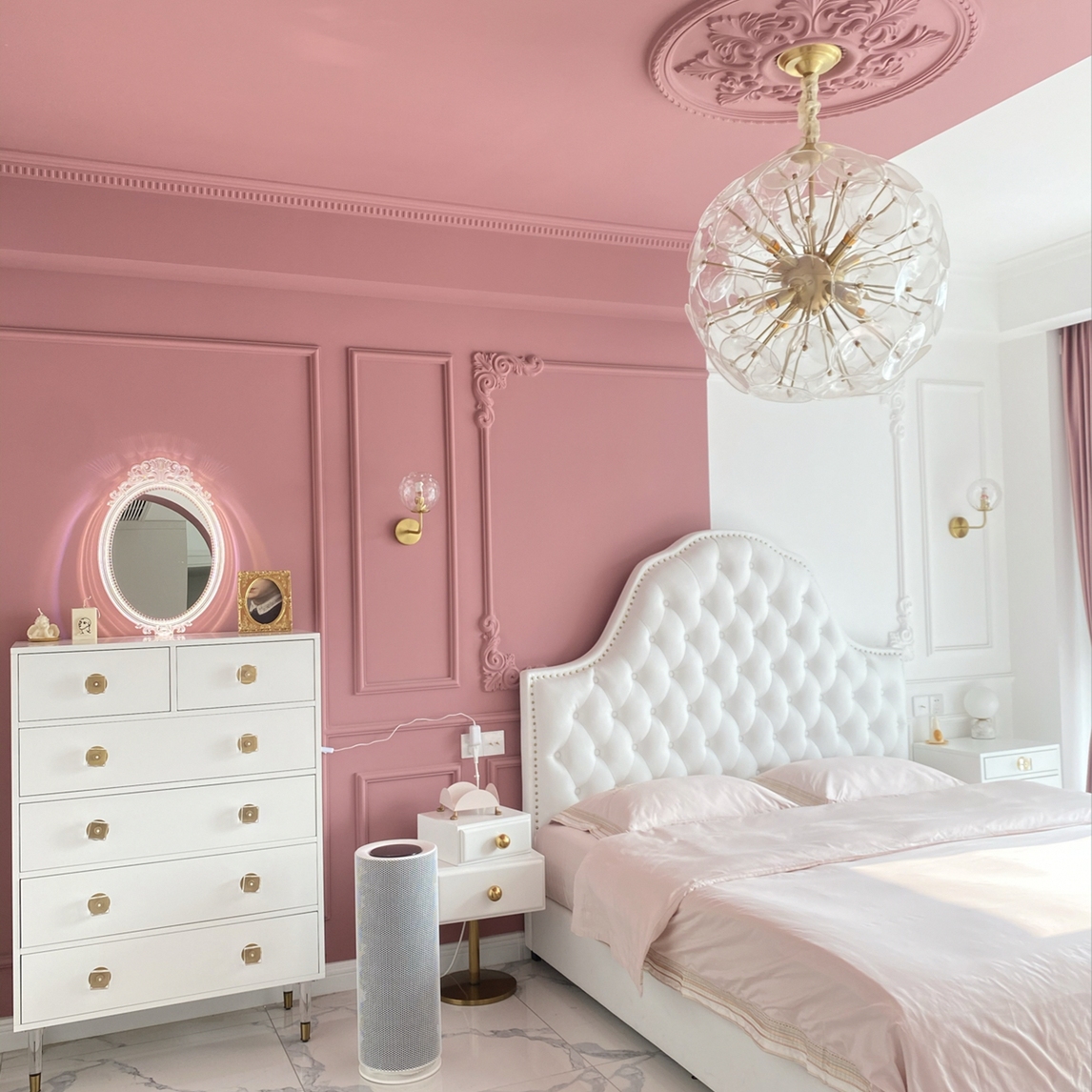 粉色的墙面搭配奶油色系的家具,超仙女,而且斗柜是金色的拉手点缀,轻奢有质感,这样的卧室,我简直太喜欢啦。