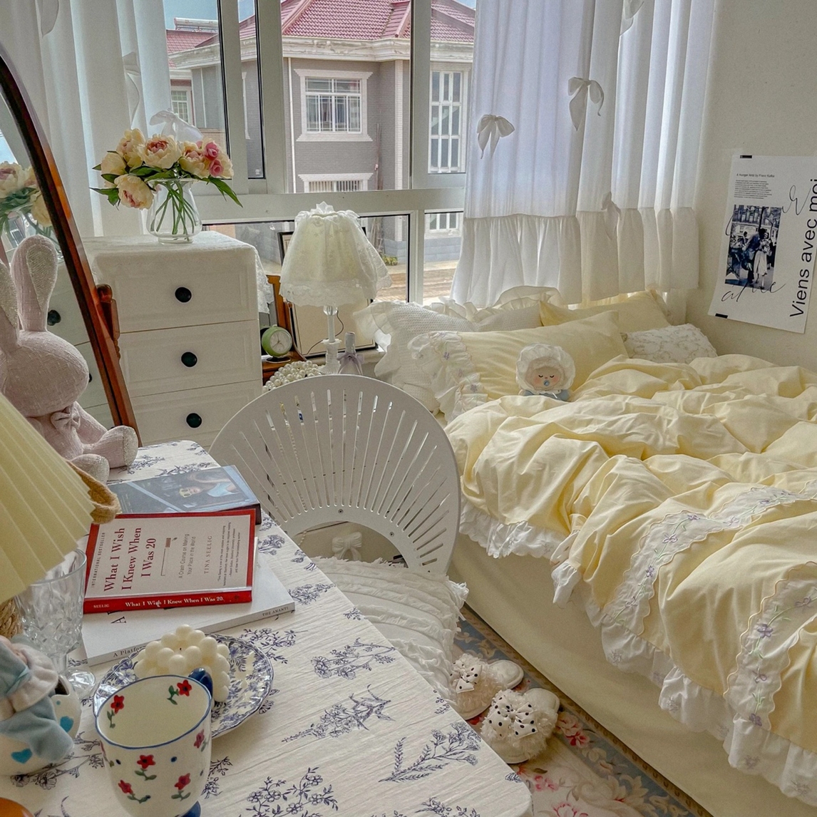 甜美少女感的卧室,蕾丝四件套,淡黄色,非常的甜美。搭配法式窗帘,蕾丝点缀,白色的,超级仙女。 复古穿衣镜,今日做一个美美哒小仙女。
