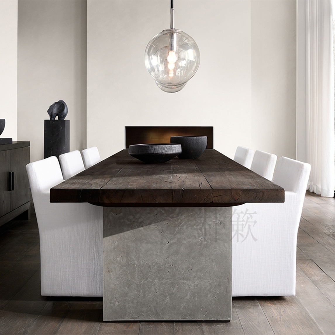 这款餐桌的桌腿是水泥的,很稳重简洁,桌面是深色原木,很复古的感觉,原木桌面很有复古的纹理,是老树原材料做的。